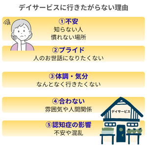 デイサービスを嫌がる理由は人それぞれですが、よくあるのは次のようなものです。