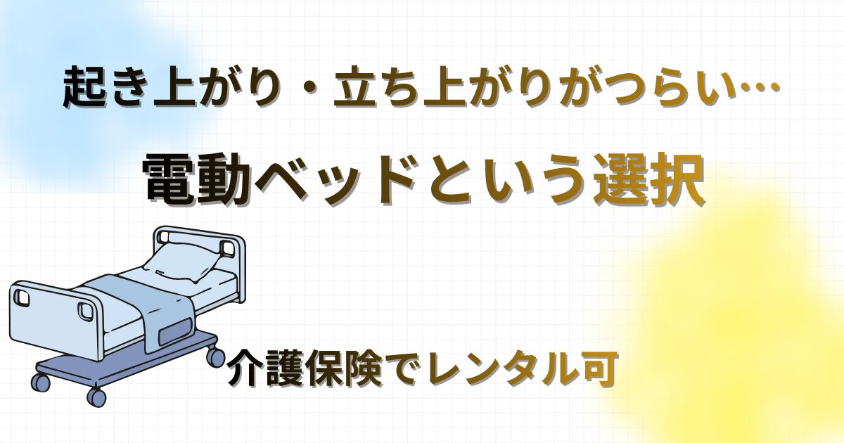 介護用電動ベッドは、背中を起こしたり高さを調整したりすることで、本人が動きやすくなるだけでなく、介護する人の負担を軽くすることもできます。また、一定の条件を満たせば介護保険でレンタルすることも可能です。
