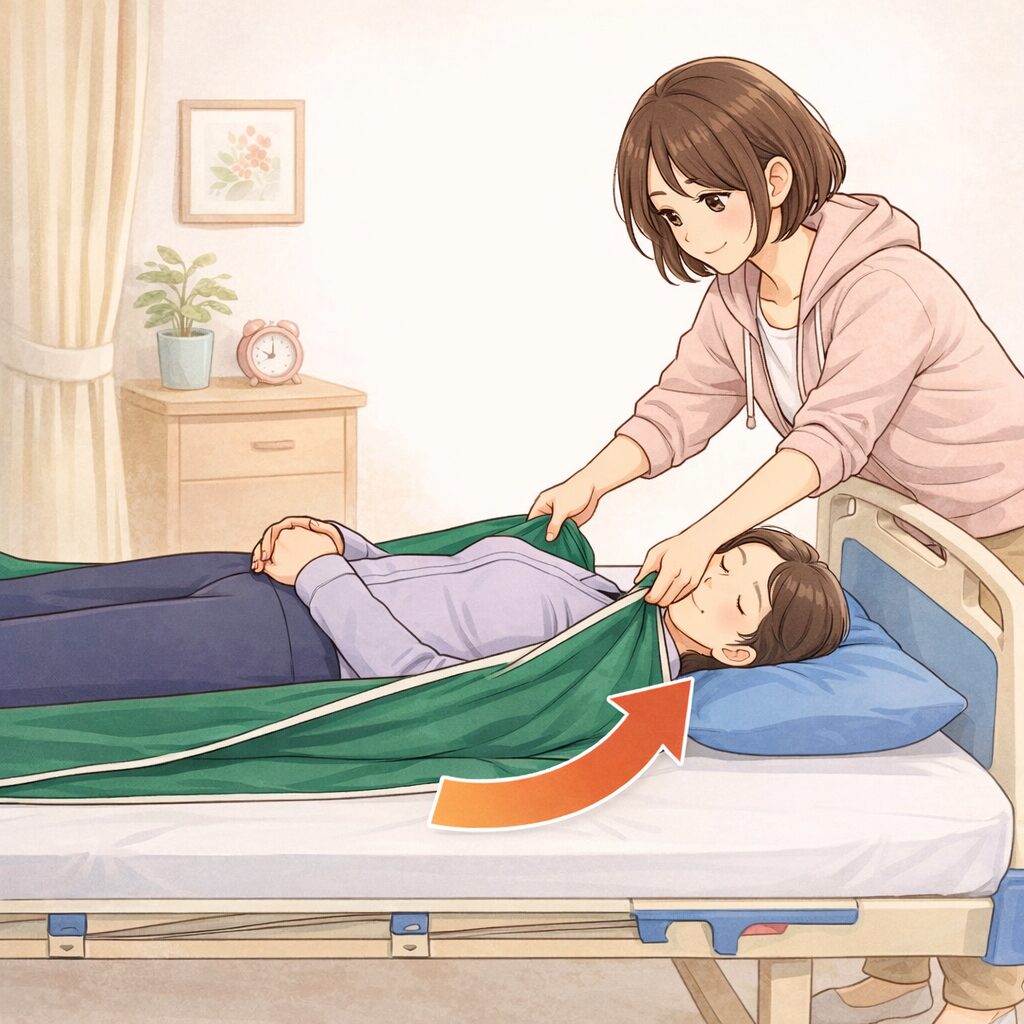 母の体の下にスライドシートを敷き、スライドシートを引っ張れば、スムーズに動かせました。