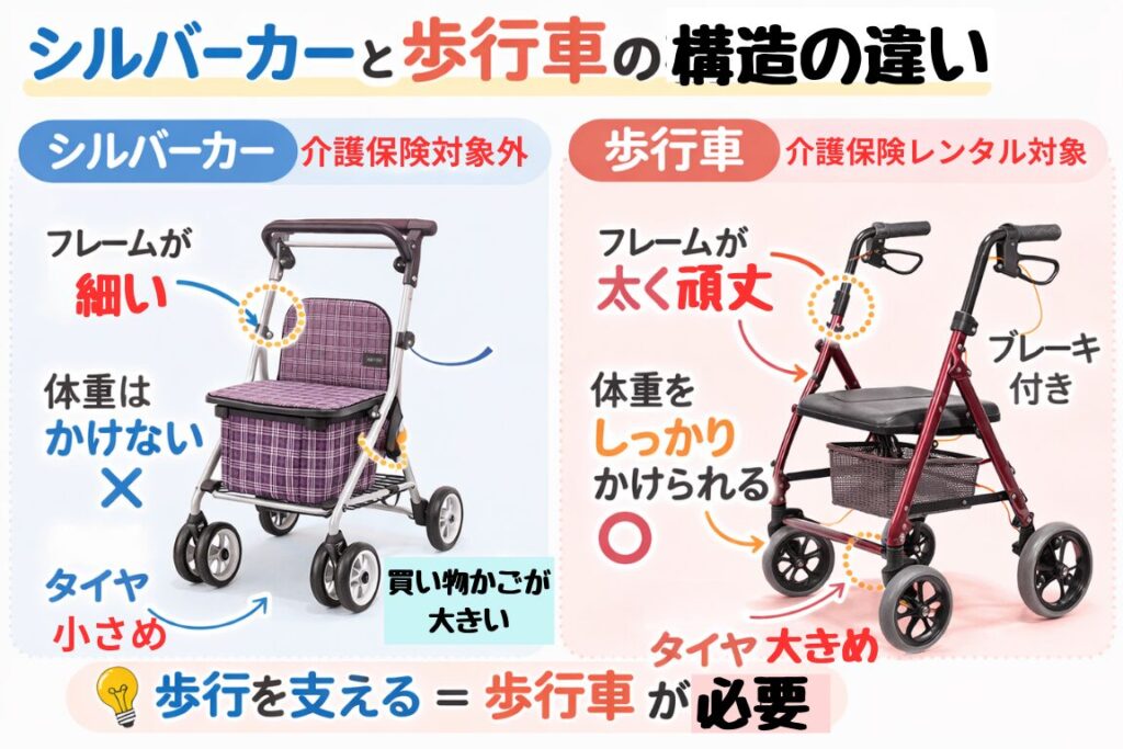 歩行車とシルバーカーは、外出にも使えて、見た目は似ていますが、