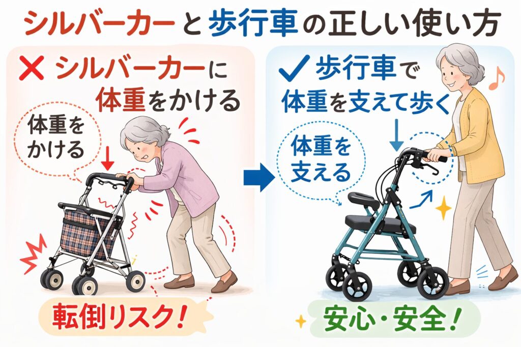シルバーカーと歩行車は見た目が似ていますが、使い方が違います。